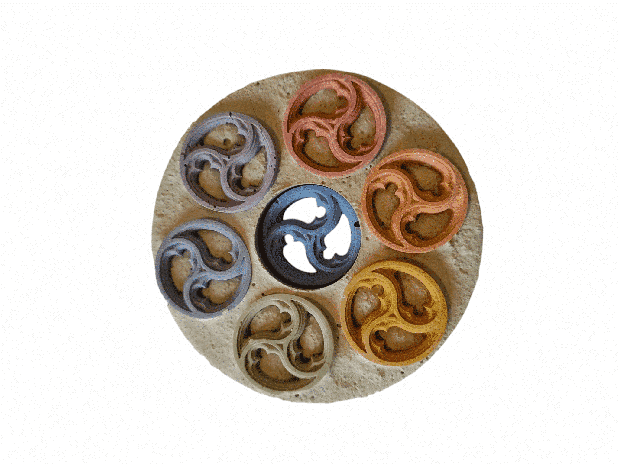 En partant de cette base, nous avons eu l’idée de placer 7 triskels aux 7 couleurs des différents chakras sur une base en Géopolymère afin de dynamiser des flacons d’huiles essentielles, ou autres produits (gemmothérapie, teintures mère, élixirs floraux), des cristaux …