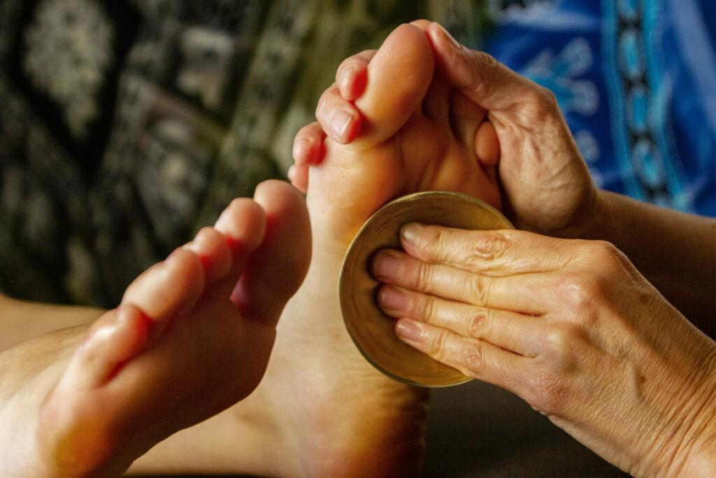 La réflexologie plantaire au bol Kansu, issu de la médecine ayurvédique, relaxe, apaise. D’autre part, la stimulation des 6 méridiens du pied ainsi que certains points marmas (points d’acupuncture ayurvédiques) permet de relancer la circulation énergétique de votre corps et rééquilibrer les 5 éléments présents dans notre corps (terre, eau, feu, air et ether).